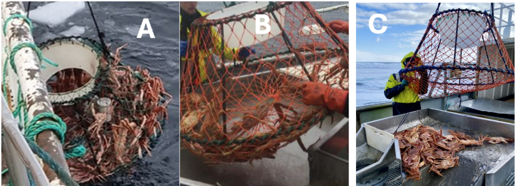 Når bunnen er åpnet og teinen løftes, (Figur 2B) er det viktig å tømme teinen så skånsomt som mulig, unngå å riste løs krabbe som ikke lett faller ned og unngå å rive løs krabben etter klør og gangbein.